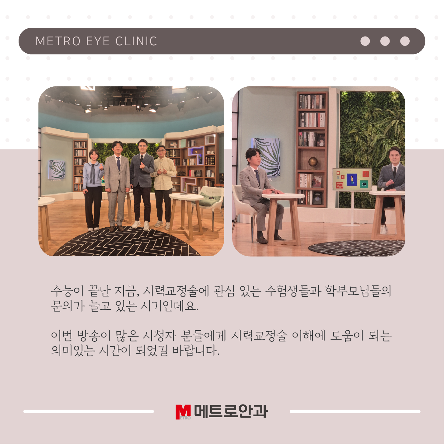 수능이 끝난 지금, 시력교정술에 관심 있는 수험생들과 학부모님들의 문의가 늘고 있는 시기인데요. 이번 방송이 많은 시청자 분들에게 시력교정술 이해에 도움이 되는 의미있는 시간이 되었길 바랍니다.
