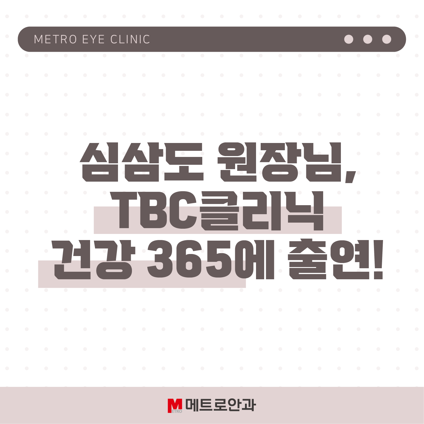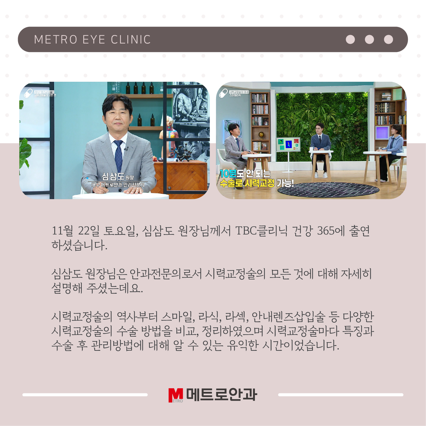 11월 22일 토요일, 심삼도 원장님께서 TBC클리닉 건강 365에 출연하셨습니다. 심삼도 원장님은 안과전문의로서 시력교정술의 모든 것에 대해 자세히 설명해 주셨는데요.